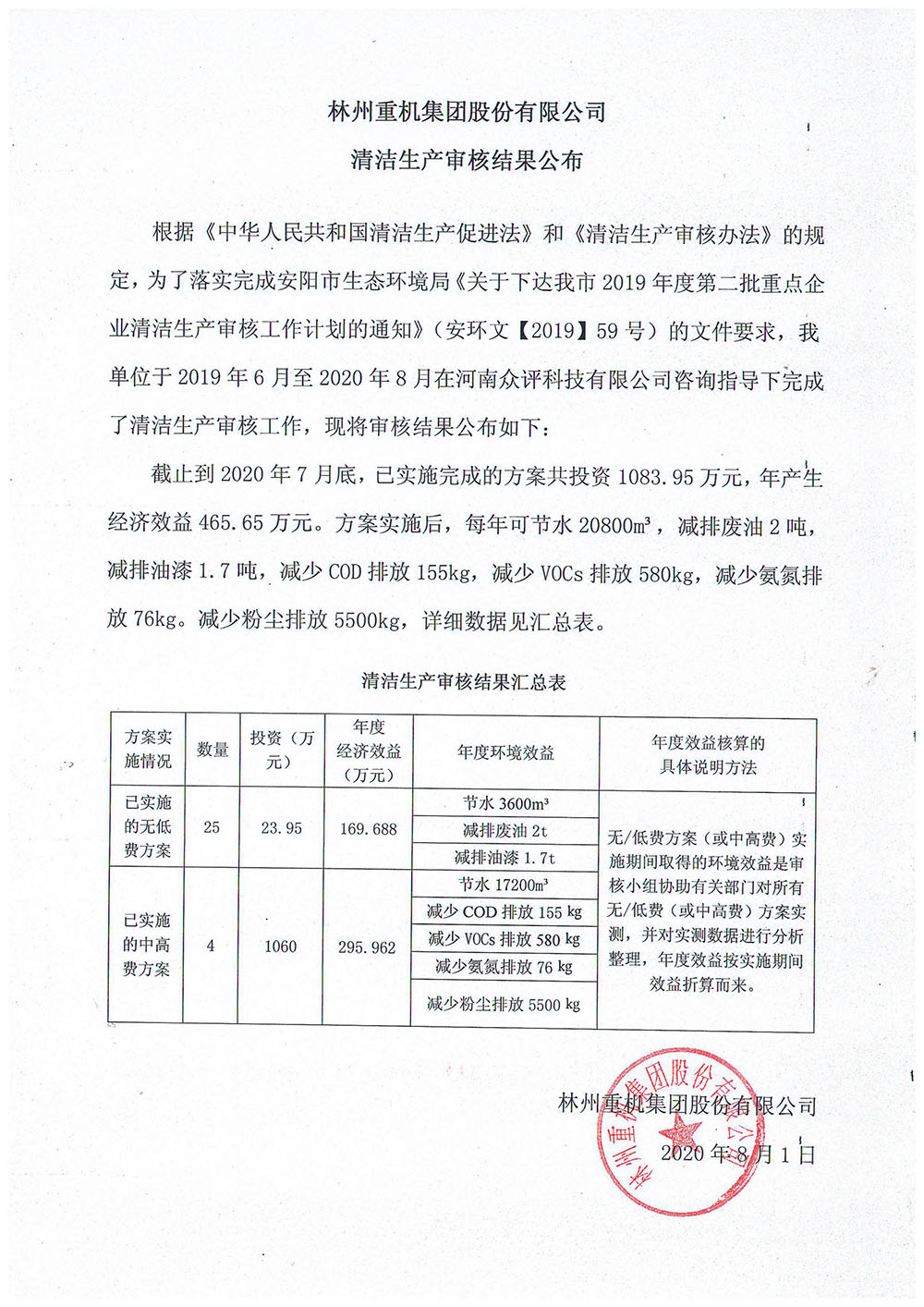 林州重機集團股份有限公司清潔生產審核結果公布